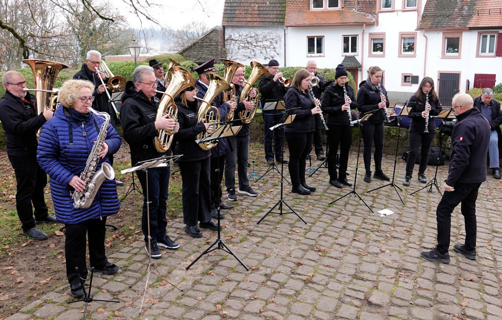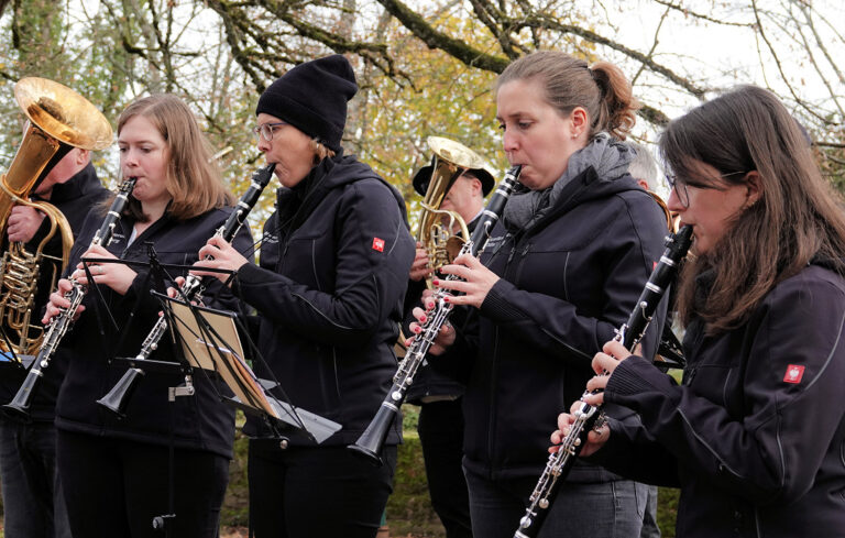Der Musikverein schloss die Gedenkstunde mit dem Stück „Ich hatt’ einen Kameraden“. Zum Abschluss dankte Erles allen Beteiligten und rief dazu auf, Frieden im Alltag zu stärken.