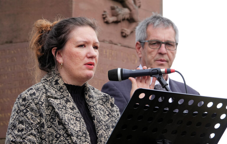 Pfarrerin Franziska Schmidt stellte in ihrer Ansprache die Bedeutung des Erinnerns in den Mittelpunkt. „Erinnerung ist oft unbequem“, sagte sie, „aber unverzichtbar, weil Mitgefühl ohne sie verkümmert – und ohne Mitgefühl kein Frieden entsteht.“ Sie verwies auf die Jahreslosung 2026: „Siehe, ich mache alles neu“ und betonte, dass Erneuerung nicht von allein komme. Frieden sei keine Selbstverständlichkeit, sondern eine bewusste Entscheidung.