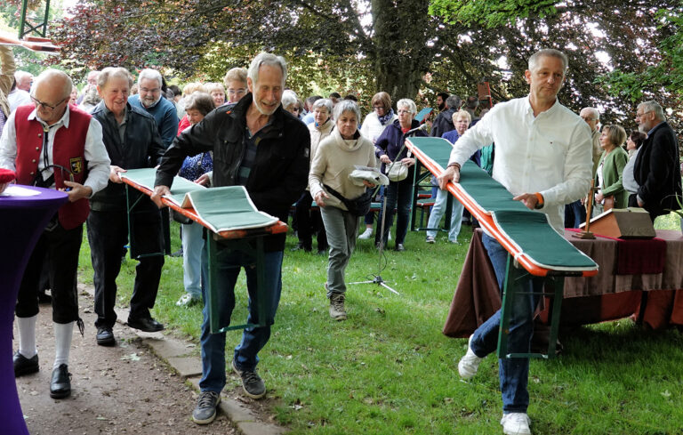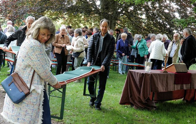 Wegen des Rücktransports der Bierbänke bat Deichl die Besucherinnen und Besucher, einerseits zu warten, bis die Bänke wieder vorne an der Kirche sind und andererseits, wenn möglich auch Bänke gleich mitzunehmen. Der Satz: „Wer eine Bank trägt, ist natürlich auch zuerst vorne“, löste ein Lachen aus und leidenschaftlich wurden die Bänke daraufhin an ihren Bestimmungsort getragen.