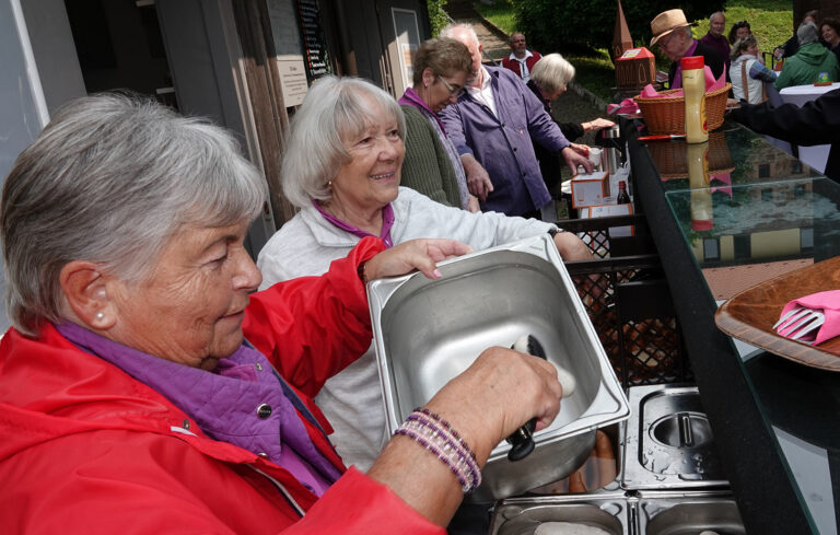 Auch die großartige und vielfältige Kuchentheke wurde für den „Nachtisch“ genutzt. Die gespendeten hausgemachten Kuchen von vielen Unterstützern des Fördervereins fanden reißenden Absatz. Der herrliche Platz, das kulinarische Angebot, Getränkeauswahl und die Gemeinschaft luden zum Verweilen ein.
