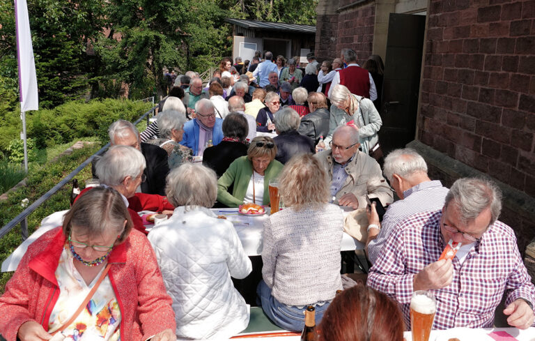 Viele Gäste wollten den Gottesdienst bei einem Imbiss auf der Terrasse vor der Kirche ausklingen lassen. Alle liebevoll geschmückten Sitzplätze und Stehtische waren bis auf den letzten Platz belegt.